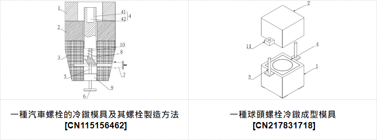 本項分類號(B21J013 )之專利包括『一種汽車螺栓的冷鐓模具及其螺栓製造方法、一種球頭螺栓冷鐓成型模具』等專利,以下為本期專利摘要說明。