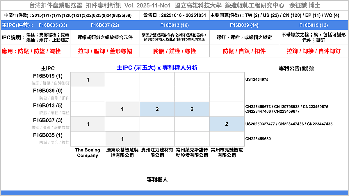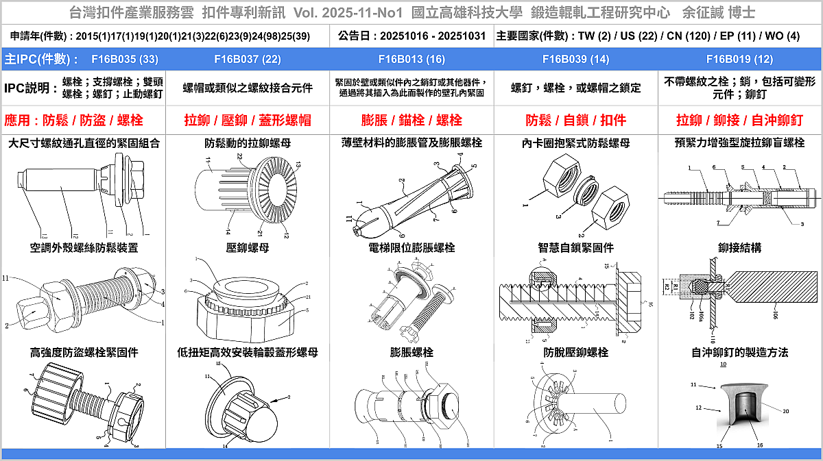 [1] 台灣扣件產業服務雲, 扣件專利新訊, Vol. 2025-11-No1, https://www.tw-fastener.com/tfsc/knowledge/BLP_0acda687-e7fb-42fd-925b-c96d223b1367