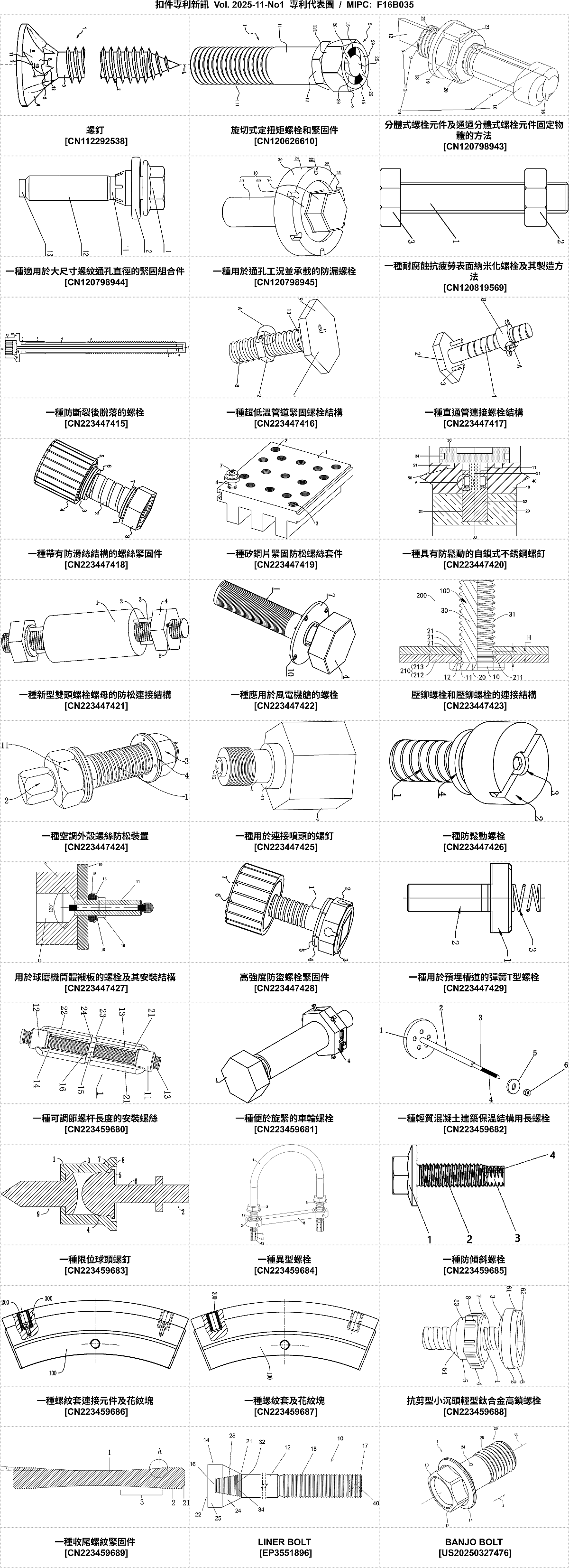 [2] 台灣扣件產業服務雲, 扣件專利新訊, Vol. 2025-11-No1, 專利清單 EXCEL, https://docs.google.com/spreadsheets/d/1xQQ9WFyHUskeEVX4c9kVrNjiCvO0bz95/edit?usp=drive_link&ouid=112972152770097436121&rtpof=true&sd=true