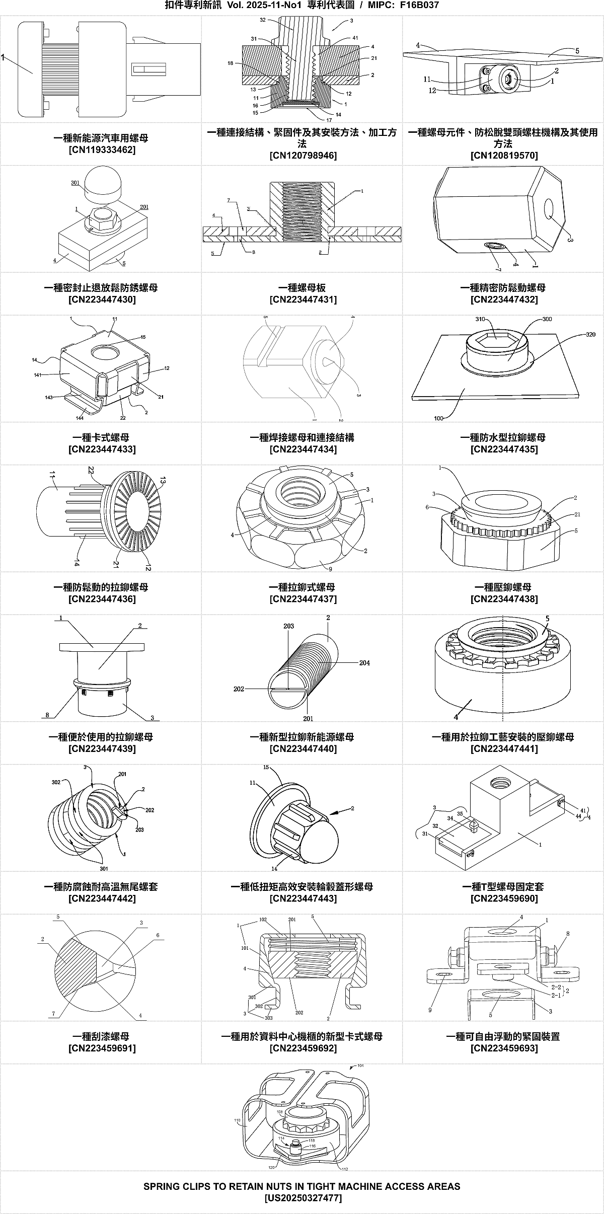 本項分類號(F16B037)之專利包括『一種新能源汽車用螺母、一種連接結構、緊固件及其安裝方法、加工方法、一種螺母元件、防鬆脫雙頭螺柱機構及其使用方法、一種密封止退放鬆防銹螺母、一種螺母板、一種精密防鬆動螺母、一種卡式螺母、一種焊接螺母和連接結構、一種防水型拉鉚螺母、一種防鬆動的拉鉚螺母、一種拉鉚式螺母、一種壓鉚螺母、一種便於使用的拉鉚螺母、一種新型拉鉚新能源螺母、一種用於拉鉚工藝安裝的壓鉚螺母、一種防腐蝕耐高溫無尾螺套、一種低扭矩高效安裝輪轂蓋形螺母、一種T型螺母固定套、一種刮漆螺母、一種用於資料中心機櫃的新型卡式螺母、一種可自由浮動的緊固裝置、SPRING CLIPS TO RETAIN NUTS IN TIGHT MACHINE ACCESS AREAS』等專利,以下為本期專利摘要說明。