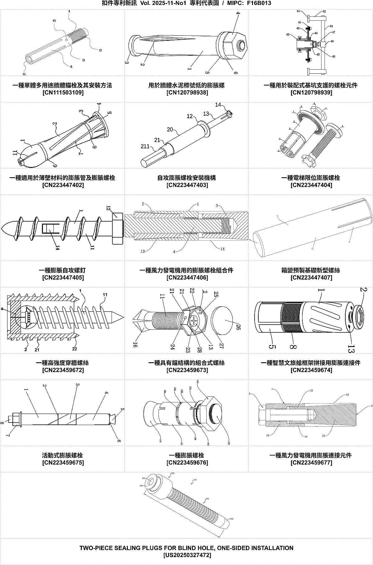 本項分類號(F16B013)之專利包括『一種單體多用途牆體錨栓及其安裝方法、用於牆體水泥標號低的膨脹螺、一種用於裝配式基坑支護的螺栓元件、一種適用於薄壁材料的膨脹管及膨脹螺栓、自攻膨脹螺栓安裝機構、一種電梯限位膨脹螺栓、一種膨脹自攻螺釘、一種風力發電機用的膨脹螺栓組合件、箱變預製基礎新型螺絲、一種高強度穿牆螺絲、一種具有錨結構的組合式螺絲、一種智慧文旅艙框架拼接用膨脹連接件、活動式膨脹螺栓、一種膨脹螺栓、一種風力發電機用膨脹連接元件、TWO-PIECE SEALING PLUGS FOR BLIND HOLE, ONE-SIDED INSTALLATION』等專利,以下為本期專利摘要說明。
