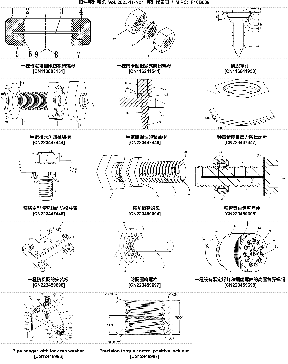 本項分類號(F16B039)之專利包括『一種輸電塔自鎖防鬆薄螺母、一種內卡圈抱緊式防鬆螺母、防脫螺釘、一種電梯六角螺栓結構、一種定距彈性鎖緊並帽、一種高精度自反力防鬆螺母、一種穩定型擰緊軸的防鬆裝置、一種防鬆動螺母、一種智慧自鎖緊固件、一種防鬆脫的安裝板、防脫壓鉚螺栓、一種設有緊定螺釘和鋸齒螺紋的高壓氧彈螺帽、Pipe hanger with lock tab washer、Precision torque control positive lock nut』等專利,以下為本期專利摘要說明。