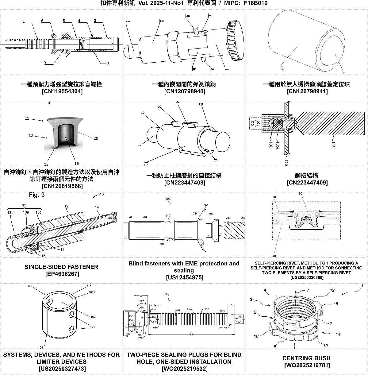 全球專利資料庫近期公告159筆扣件新專利,公告日介於20251016至20251031間,申請國件數分別為台灣(TW)2件、美國(US)22件、中國(CN)120件、歐洲(EP)11件與世界(WO)4件,專利權人包括台灣的『恒昌行精密工業有限公司、奧地利商阿維奧公司』;美國的『The Boeing Company、Spirol Industries Ltd.、Schroff GmbH、PERFECTVISION MANUFACTURING, INC.、PEGATRON CORPORATION』;中國的『江蘇中茂金屬科技有限公司、南通賽福特五金科技有限公司、海鹽元中五金股份有限公司、浙江吉達金屬有限公司、浙江海力股份有限公司』;歐洲的『Simpson Strong-Tie Company, Inc.、SENS-IN S.r.l.、Ortho Hub Ventures UG (Haftungsbeschränkt)、Oldnall, Craig、Littelfuse, Inc.』;與世界的『REM INDUSTRIE S.R.L.、Growermetal S.p.A.、BAIER & MICHELS GMBH & CO. KG、AVDEL UK LTD.』 … 等專利權人(完整專利權人請詳參專利清單)。