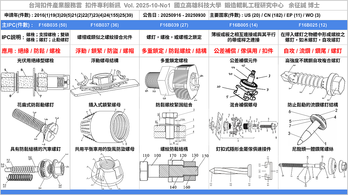 [1] 台灣扣件產業服務雲, 扣件專利新訊, Vol. 2025-10-No1, https://www.tw-fastener.com/tfsc/knowledge/BLP_94ce1e49-f691-4c9f-91e1-eacadee1338c