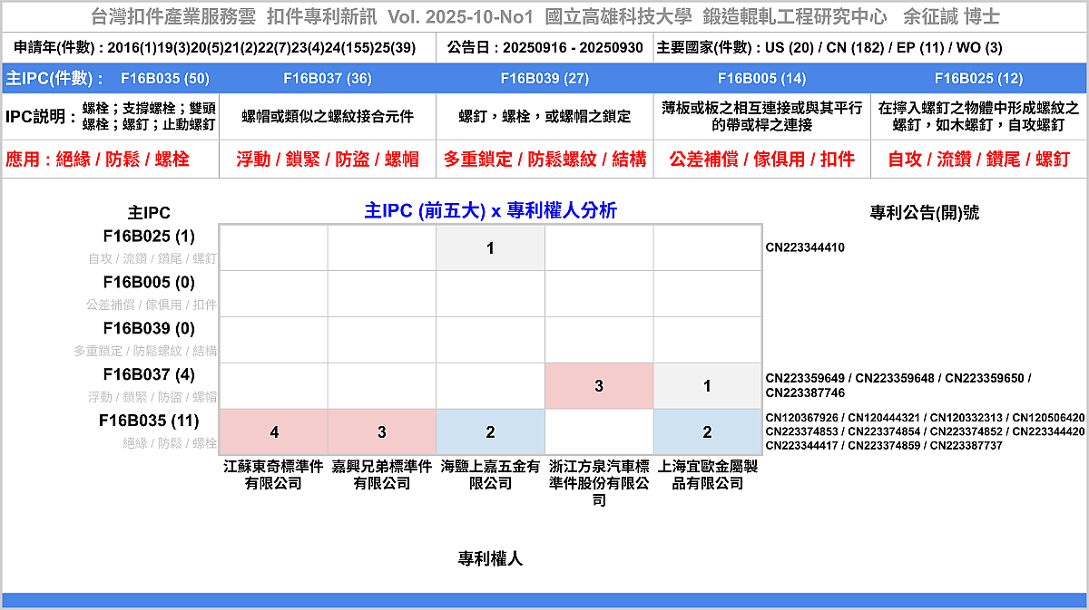 [2] 台灣扣件產業服務雲, 扣件專利新訊, Vol. 2025-10-No1, 專利清單 EXCEL, https://docs.google.com/spreadsheets/d/1xS4Fg-Xoml9KHSDEKwXv30_AHRa8UWv3/edit?usp=drive_link&ouid=112972152770097436121&rtpof=true&sd=true