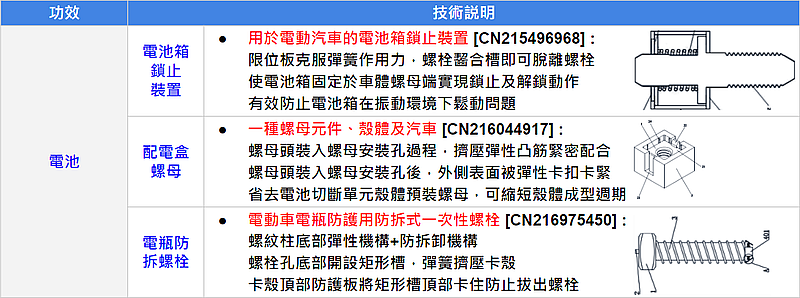 (4)F16B005:螺栓螺母元件、電池包安裝結構及純電動汽車、螺母組件及電動汽車、一種純電動汽車輔助配件等專利。