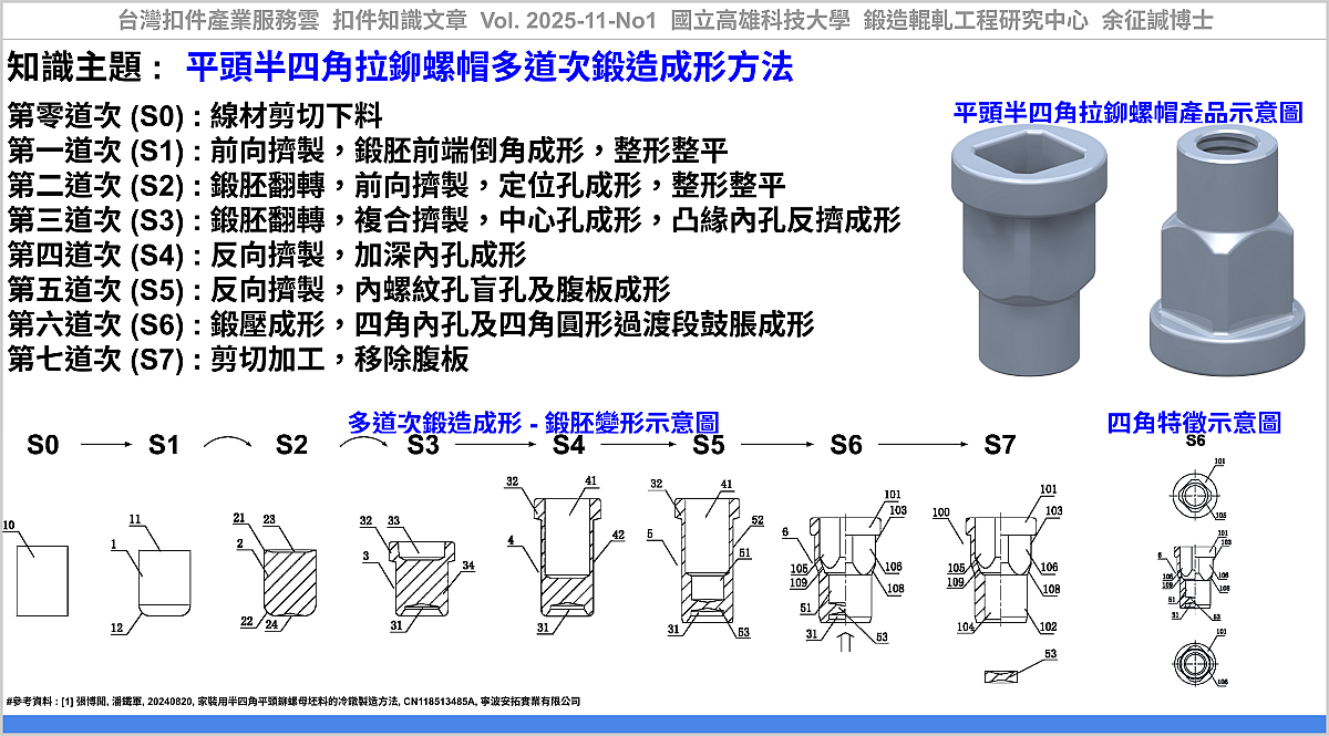 - 2025-11-No1-扣件知識文章, 平頭半四角拉鉚螺帽多道次鍛造成形方法, https://www.tw-fastener.com/tfsc/knowledge/BLP_82e539c2-7b86-46a3-8402-e88966a0e62f
