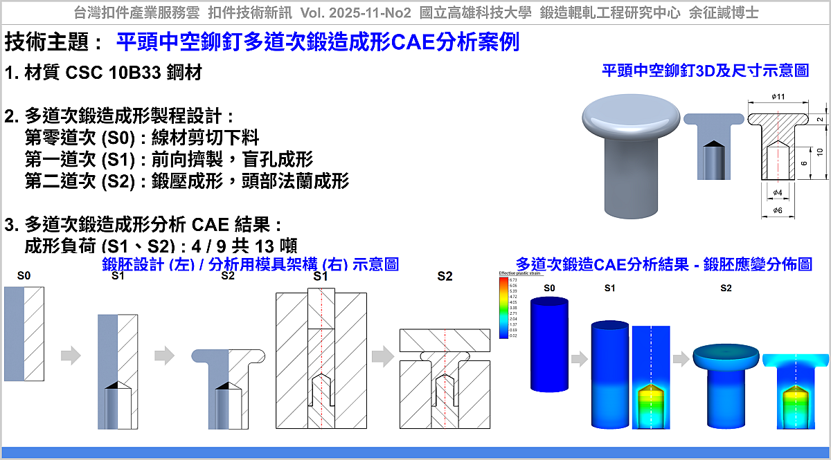 [1] 台灣扣件產業服務雲, 扣件技術新訊, Vol. 2025-11-No2, 平頭中空鉚釘多道次鍛造成形CAE分析案例, https://www.tw-fastener.com/tfsc/knowledge/BLP_e0064ae9-5a3a-449f-bc7a-a673635e49ae