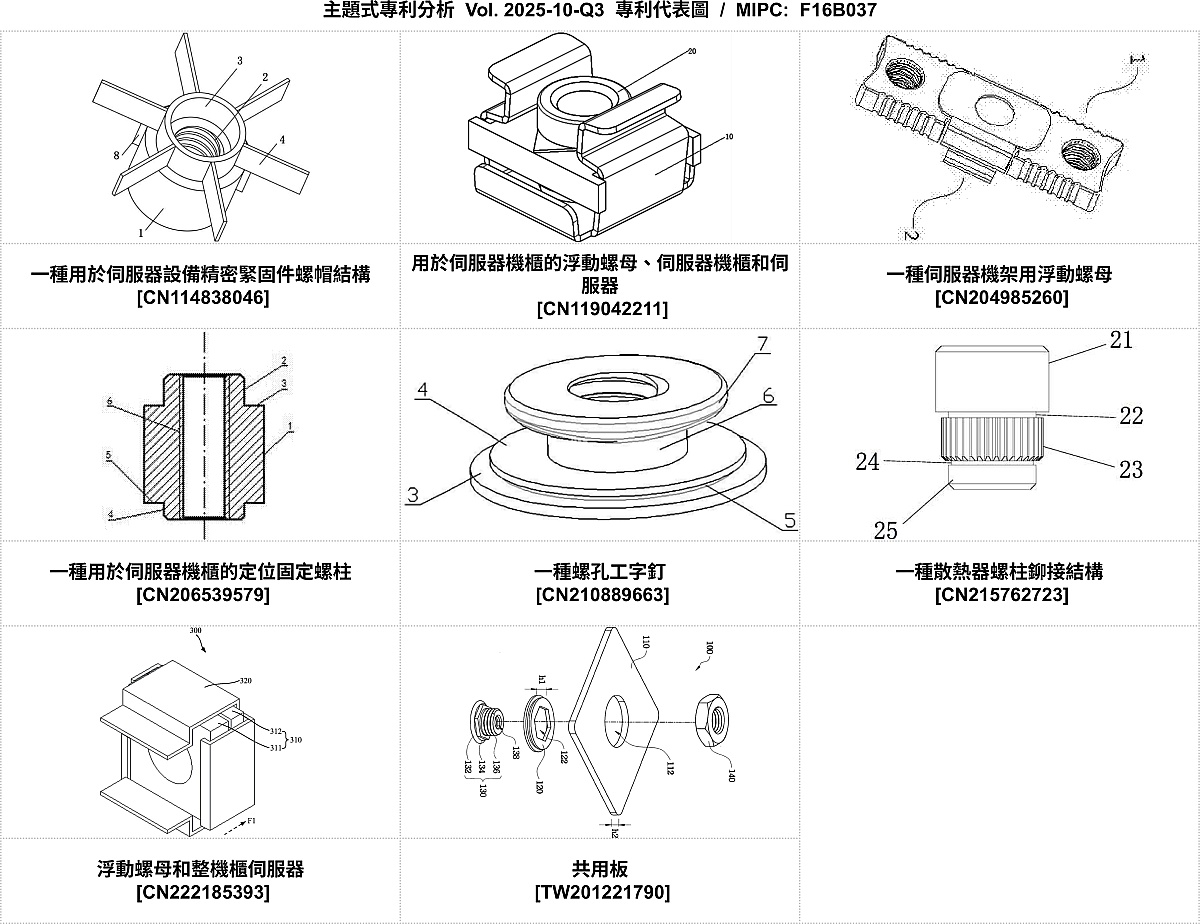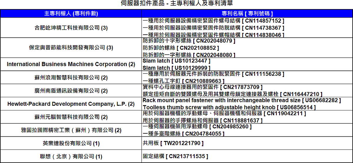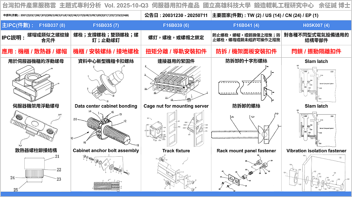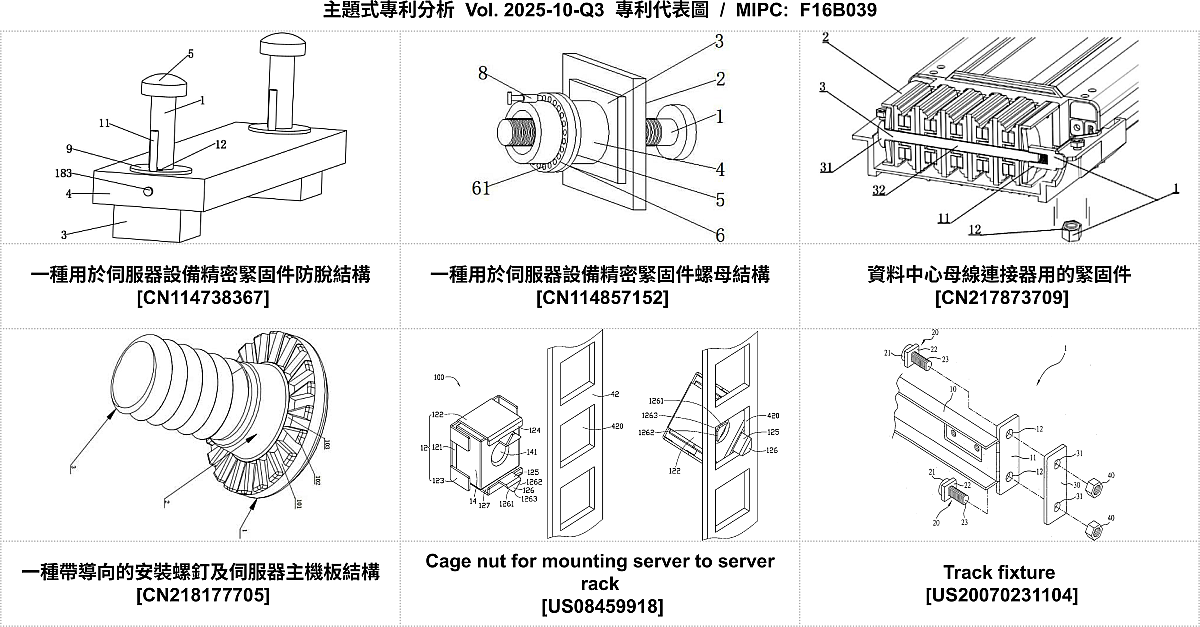 [1] 台灣扣件產業服務雲, 主題式專利分析, 伺服器用扣件產品, Vol. 2025-10-Q3, https://www.tw-fastener.com/tfsc/knowledge/BLP_f95282ac-9e47-48a3-8818-6d6c99b31aac