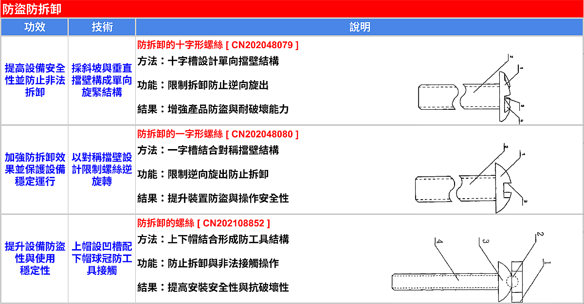 本項分類號(F16B041)之專利包括『防拆卸的十字形螺絲、防拆卸的一字形螺絲、防拆卸的螺絲、Rack mount panel fastener with interchangeable thread size』等專利,以下為本期專利摘要說明。