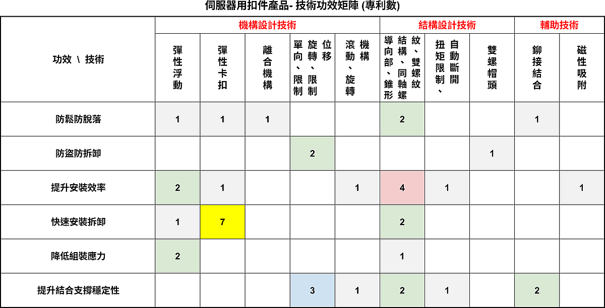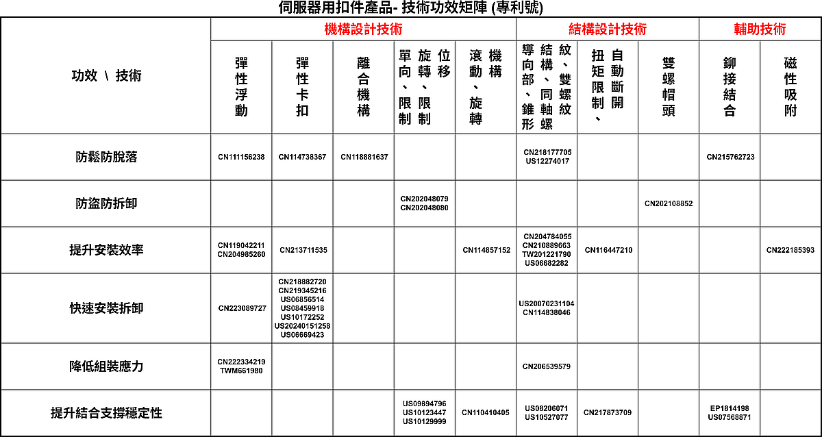 透過解析專利説明文件,建立專利之技術與功效矩陣(如下圖),包括『機構設計技術、結構設計技術、輔助技術』等技術領域。